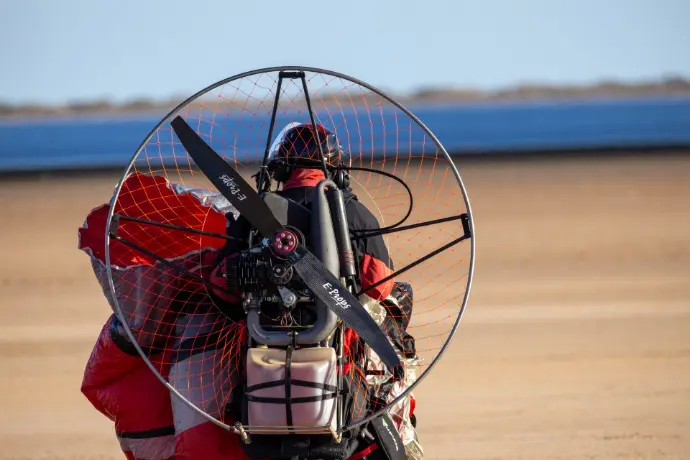 On the vast, untouched landscapes of southern Tunisia, a paramotor pilot prepares for takeoff, surrounded by endless sandy terrain and a clear blue sky. This moment captures the spirit of adventure and freedom that defines the DesertFlow experience.